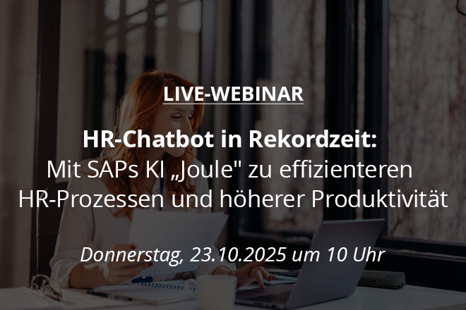 Mit SAPs KI „Joule” bauen Sie in Rekordzeit einen unternehmensweiten HR-Chatbot – und das ganz ohne tiefgehende Programmierkenntnisse. In unserem Webinar zeigen wir Ihnen praxisnah Schritt für Schritt, wie Sie alltägliche HR-Prozesse effizient automatisieren. So etablieren Sie in kürzester Zeit einen skalierbaren Chatbot, der Ihre HR-Abteilung spürbar entlastet und die Produktivität steigert.